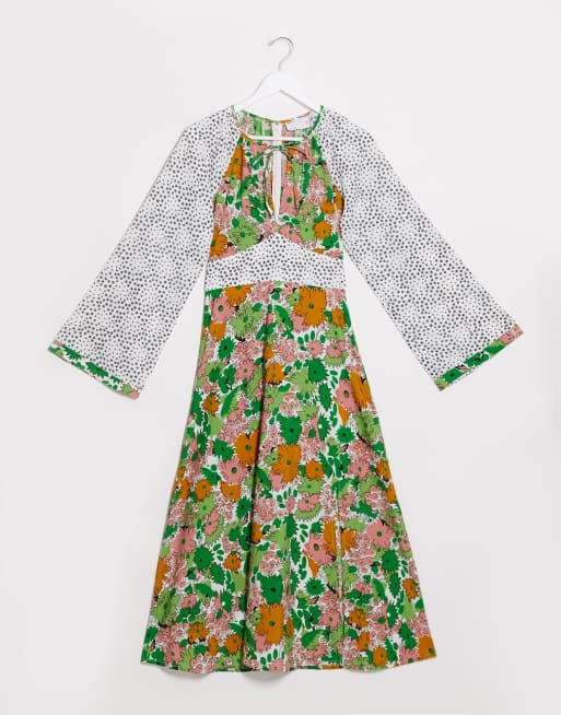 This breezy midi dress features a patchwork of art-inspired prints and patterns.